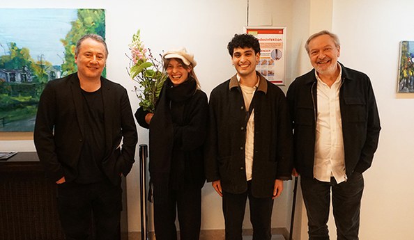 in der mitte paula van well (gewinnerin des sonderpreises der schule für dichtung) und mücahit türk (einer der sprecher des gewinner-kurzhörspiels), flankiert von jürgen berlakovich und fritz ostermayer