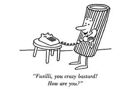 der nicht ganz unbekannte neo-lehrer tex rubinowitz wird sich in seiner klasse der poesie extrem verdichteter kürzestwitze widmen. zitat tex: “es geht um die essenz, die entweder ohne große umwege erreicht werden soll, oder um ecken und erweiterte ebenen. was ist witzig? ist witzig, was alle witzig finden? wenn nicht, warum nicht?“ der arbeitstitel der klasse, geliehen von einem new-yorker-cartoon von charles barsotti, besitzt die essenz bereits in reiner pastaform: "fusilli you crazy bastard, how are you?"