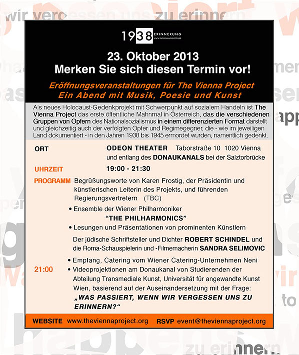 karen frostig, us-künstlerin und leiterin dieses wichtigen projekts, das sich bis mai 2014 auf den straßen wiens und am donaukanal realisieren wird, äußerte bei einem treffen mit uns den wunsch und die hoffnung, dass sich auch autorInnen/studentInnen aus dem umfeld der sfd am “vienna project” beteiligen. wir schließen uns karens wunsch und hoffnung von ganzem antifaschistischen herzen an. und verlinken hiermit: