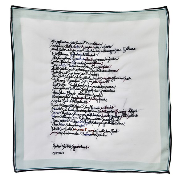 zu sehen in der sfd: eine auswahl an "stofftaschentüchern" aus den gedichtzyklen "101 taschentücher der tränen", "19 taschentücher der krise", "213 taschentücher der liebe (frei nach ramon llull)" und "taschentuchgedichte, gewidmet".